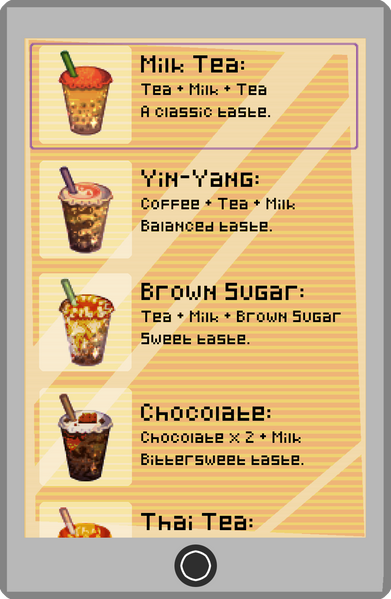 This is Boba Bonds! A game about making milk tea and bonding with your customers. My goal for this game is to bring joy to others through simple but fun interactions. With this page I'll share my designs, sketches, and inspirations.